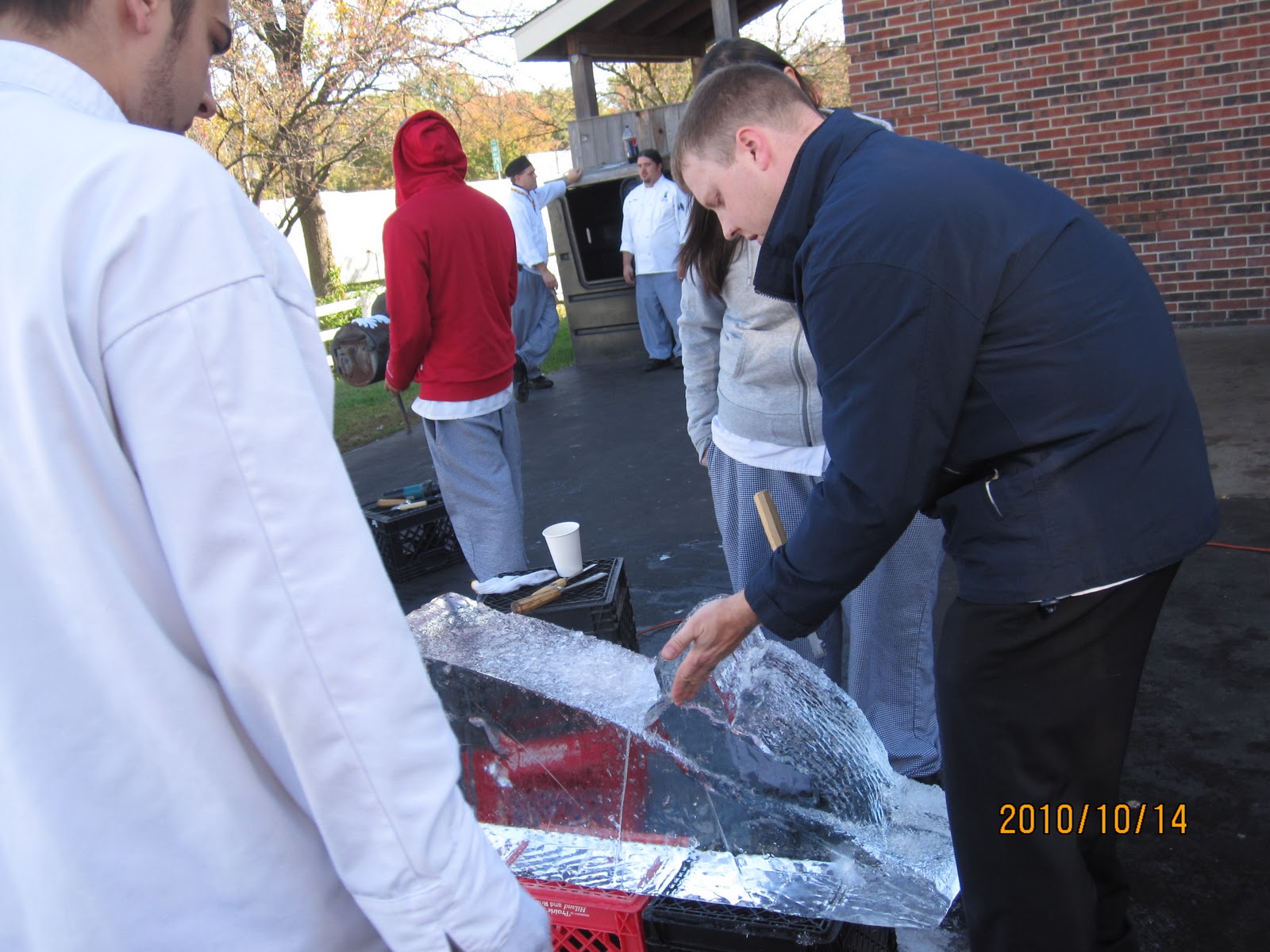 Last week we spent two days carving ice. That was...uh...interesting...and a LOT of fun! Joyce was my partner the first day and we made a vase. We had three choices that day--vase, chef hat from our school logo, or a swan. The second day we could make what we wanted. DaRon & I made a cross. Crosses look very simple but they're not even a little bit. It's very difficult to get everything even and straight so you keep trying to fix it and end up with a much smaller cross than you meant. I told Chef it was an old rugged cross--emphasis on rugged. He missed the first day so I let DaRon choose our project and have all of the the power tool fun. They are addictive. I just wanted to go home and cut down some trees. I beveled the edges and made the scrolls on our cross. Anyway, while DaRon worked I had plenty of time to stalk my classmates--I mean to take pictures. None of us did too horribly for our first try, did we?